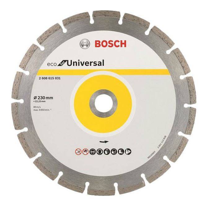 Diamantový řezný kotouč BOSCH ECO 230 mm – segment je univerzální kotouč pro suché i mokré řezání běžných stavebních materiálů. Segmentovaný řezný okraj s diamantovou vrstvou zajišťuje rychlý řez, dobrý odvod tepla a prachu a delší životnost ve srovnání s běžnými abrazivními kotouči. Vhodný pro použití v úhlových bruskách 230 mm při řezání betonu, cihel, tvárnic a střešních krytin.