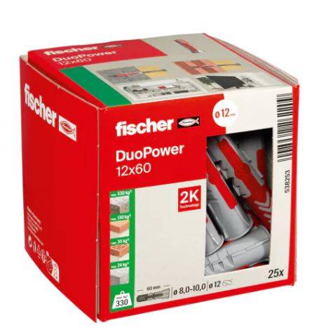 Hmoždinky fischer DuoPower 12×60 mm (25 ks) Univerzální dvousložková hmoždinka do plných i dutých podkladů. Technologie DuoPower automaticky zvolí rozpěrnou , překlápěcí nebo uzlovací funkci podle materiálu. Vysoká držnost, jisté dotažení a výborná „zpětná vazba“ při šroubování.