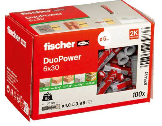 Hmoždinky fischer DuoPower 6×30 mm (100 ks) Univerzální dvousložková hmoždinka do plných i dutých materiálů. Technologie DuoPower inteligentně kombinuje rozpěrnou , překlápěcí a uzlovací funkci podle typu podkladu. Zaručuje vysoké hodnoty držnosti a výbornou zpětnou vazbu při dotažení vrutu.