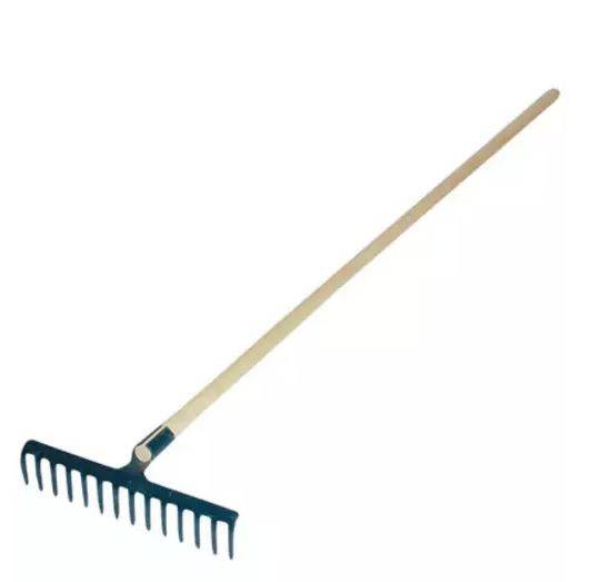 Univerzální kovové hrábě s 16 zuby a dřevěnou násadou pro údržbu zahrady i stavby. Vhodné pro hrabání trávy, listí, mechu a lehké srovnávání povrchu půdy či štěrku.