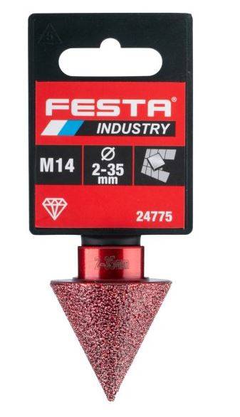 Profesionální diamantová brusná korunka FESTA INDUSTRY ve tvaru kužele je určena pro suché broušení a přesné opracování otvorů v tvrdých materiálech. Díky rozsahu 2–35 mm a závitu M14 je ideální pro úhlové brusky při obkladačských a kamenických pracích – všude tam, kde potřebujete rychle upravit nebo zvětšit již vykroužený otvor bez poškození okolního povrchu.