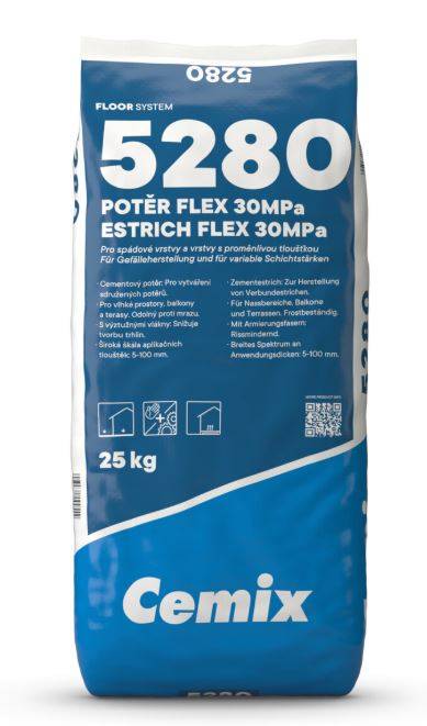 Flexibilní cementový potěr pevnostní třídy 30 MPa je suchá směs určená pro zhotovení podlahových potěrů v náročnějších podmínkách – především na balkonech, terasách, lodžiích a v exteriéru obecně. Díky upravenému složení, zvýšené pevnosti, pružnosti a odolnosti vůči vodě a mrazu je vhodný jako podklad pod keramickou dlažbu, přírodní kámen i jiné finální krytiny, včetně systémů podlahového vytápění.